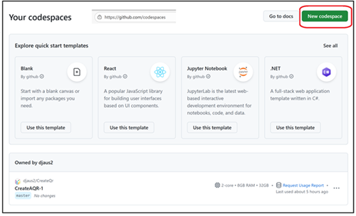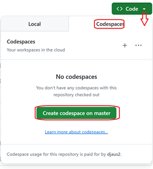2. Click on the green [<> Code] button and select the “Codespaces” tab