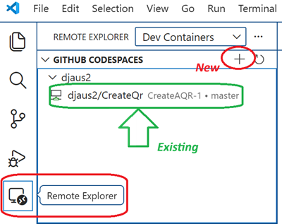 • In the Remote Explorer, under Codespaces, click the plus (+) icon.
