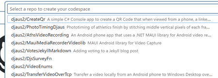 • For example the existing Codespace for this user is listed at the bottom of the dialog below.